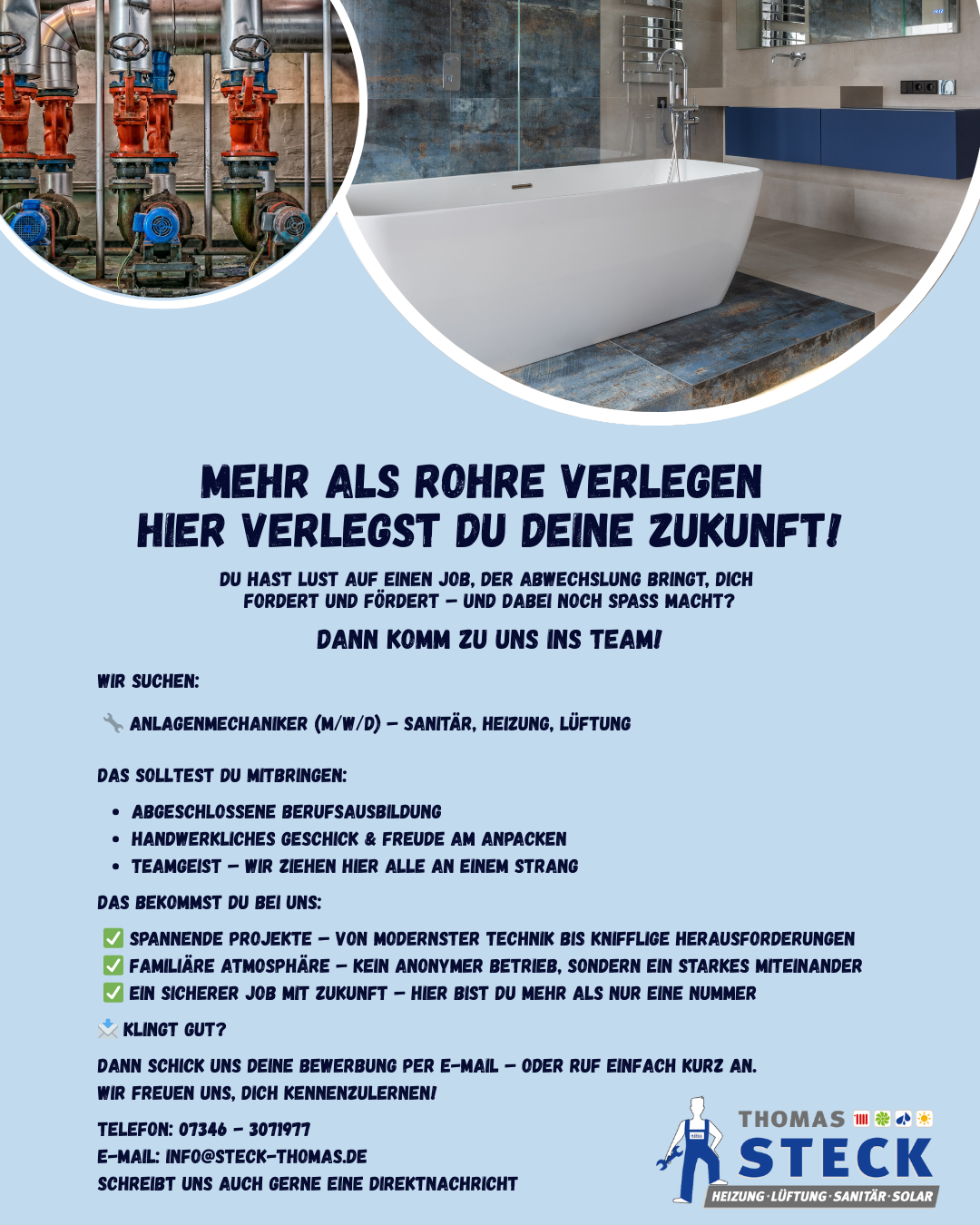 Du hast Lust auf einen Job, der Abwechslung bringt, dich fordert und fördert – und dabei noch Spaß macht? Dann komm zu uns ins Team! Wir suchen: 🔧 Anlagenmechaniker (m/w/d) – Sanitär, Heizung, Lüftung Das solltest du mitbringen: Abgeschlossene Berufsausbildung Handwerkliches Geschick & Freude am Anpacken Teamgeist – wir ziehen hier alle an einem Strang [...]